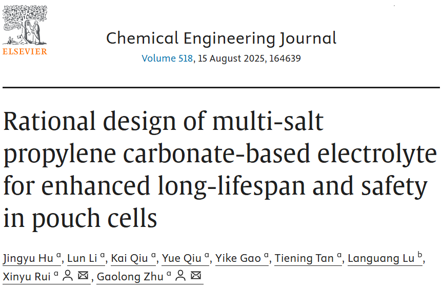 相关研究成果以“Rational design of multi-salt propylene carbonate-based electrolyte for enhanced long-lifespan and safety in pouch cells为题发表在期刊Chemical Engineering Journal上。