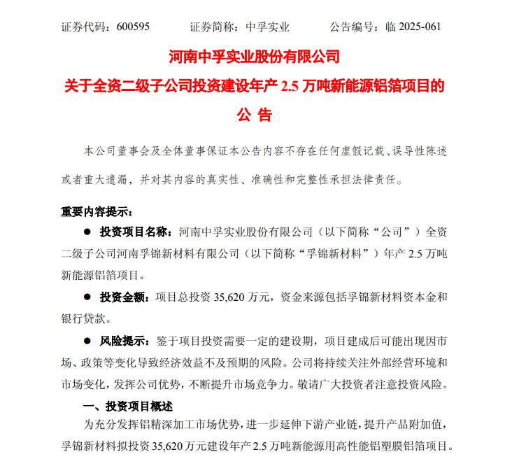 近日,中孚实业发布公告称,公司全资二级子公司河南孚锦新材料有限公司(以下简称“孚锦新材料”)计划投资3.56亿元建设年产2.5万吨新能源铝箔项目,加码高附加值铝加工赛道,进一步延伸企业下游产业链,建成后将形成规模化新能源铝箔生产能力。