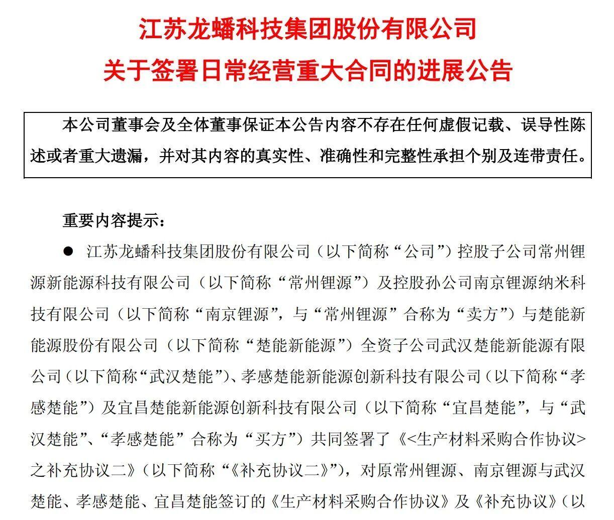 11月24日晚间,龙蟠科技公告称,公司控股子公司常州锂源及控股孙公司南京锂源(以下简称“卖方”)与楚能新能源全资子公司武汉楚能、孝感楚能及宜昌楚能(以下简称为“买方”)共同签署了《补充协议二》,对原协议相关条款进行补充与修订。