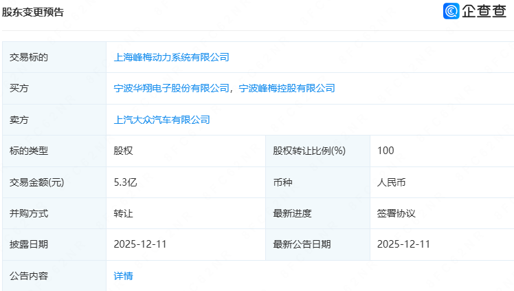 上海峰梅动力系统有限公司于5月28日成立,是上汽大众汽车有限公司的全资子公司,后者大股东为上汽集团。峰梅动力经营范围包含:电池销售,电池零配件销售等。今年4月份,峰梅汽车动力系统产业基地项目拟投资10亿元,落户上海。将由多个业务板块组成,打造集自主研发和生产制造为一体的汽车动力系统产业基地。