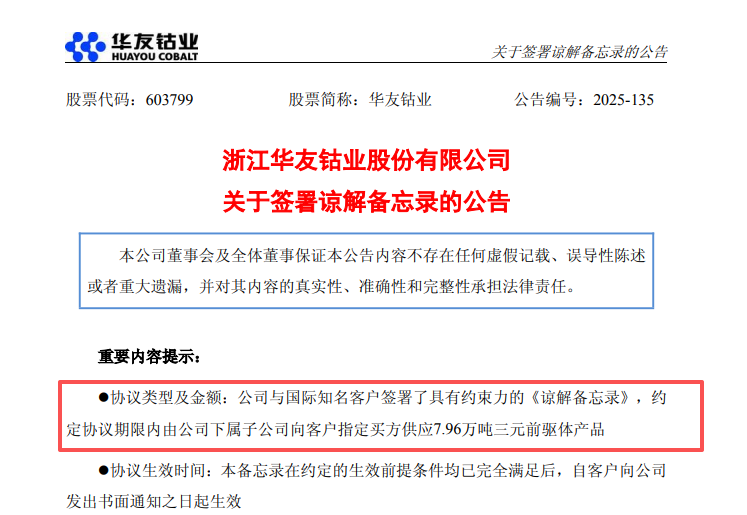 12月16日晚间,华友钴业(603799)发布公告称,公司与国际知名客户签署了具有约束力的《谅解备忘录》,约定协议期限内由公司下属子公司向客户指定买方供应7.96万吨三元前驱体产品。该供应量仅为初步约定,实际供应量以后续签订的采购协议为准。