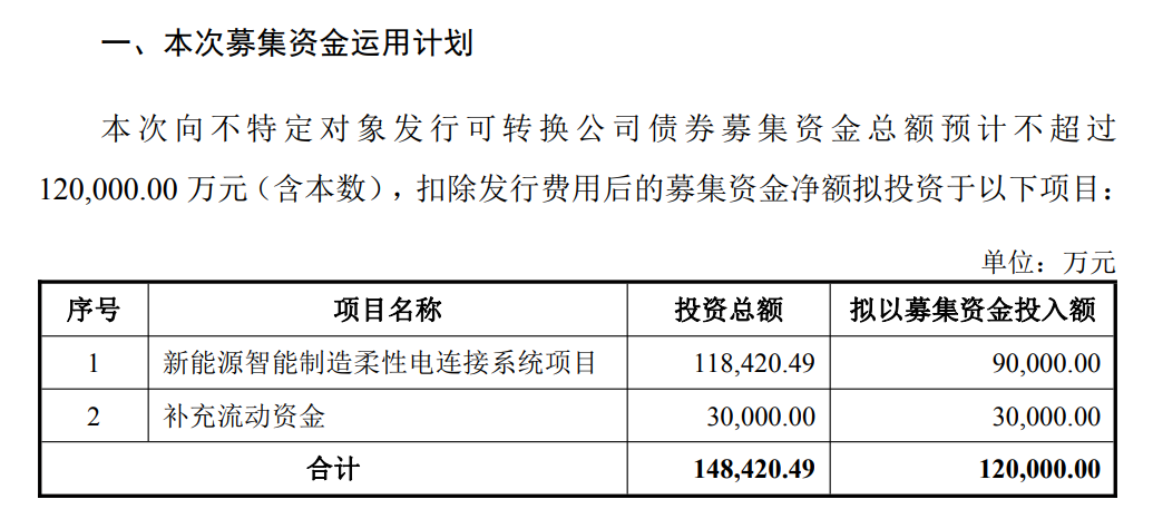 其中,新能源智能制造柔性电连接系统项目投资总额11.84亿元,拟使用募集资金9亿元,拟在江苏省常州市溧阳市新建生产基地。项目建成达产后将形成年产新型柔性电连接组件约4500万件的产能规模,从而进一步巩固公司和国内外知名新能源汽车及储能厂商的稳定合作关系,完善公司的技术能力与产业规模。