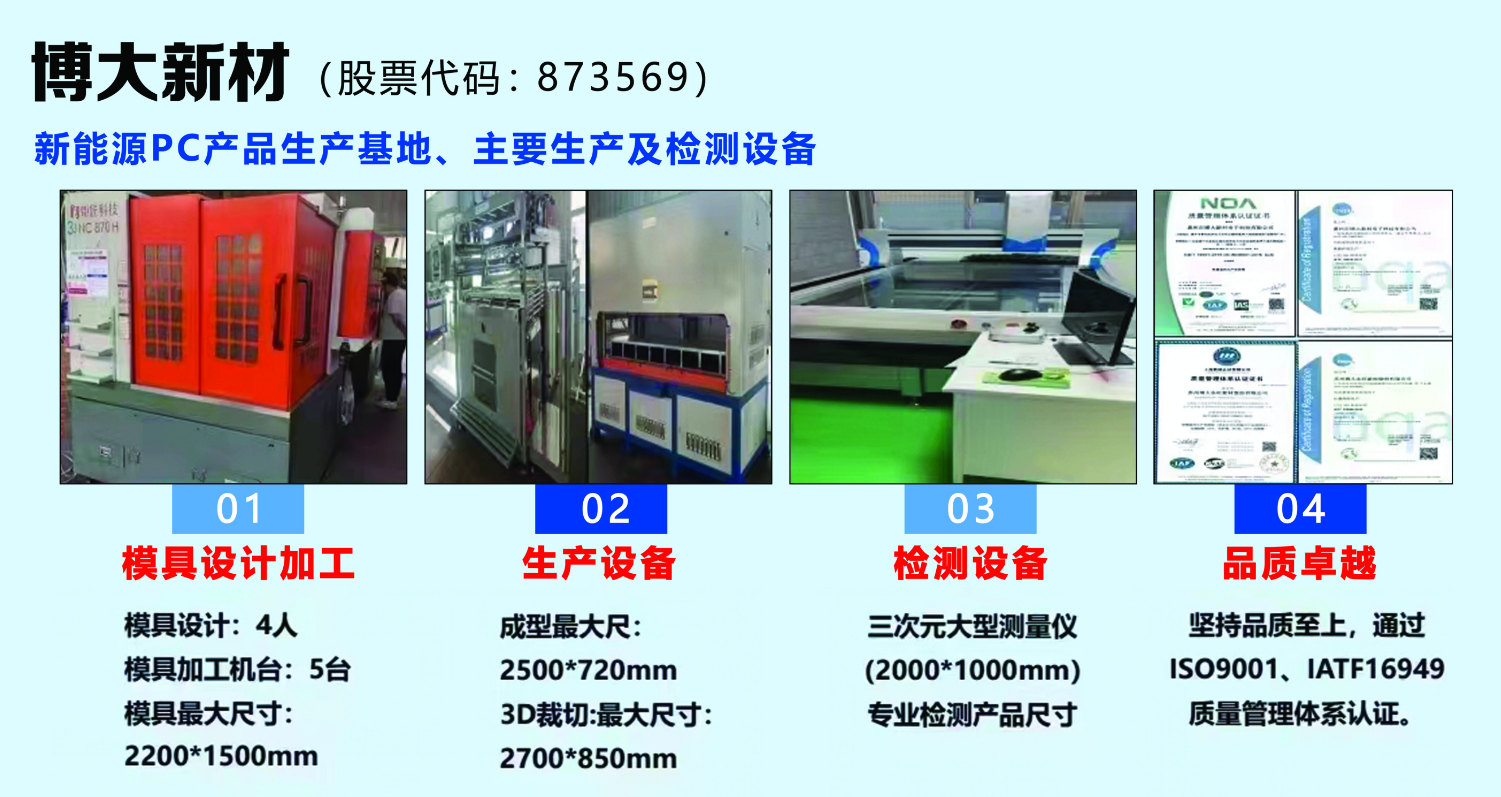博大新材新能源业务涵盖吸塑、注塑、载带、模具自主制造等多元领域,主要产品有新能源汽车电池盖、电池底托,新能源汽车CCS 隔离板、新能源汽车电机盖、新能源汽车缸盖等。