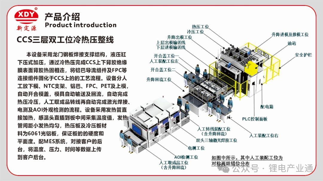 江苏力德尔电子信息技术有限公司深耕 FPC 行业多年,产品几乎覆盖了 SMT 后段的全部制程。自2019 年开始布局新能源领域,开发了自动折弯设备,用于生产车载 FPC 产品;2020 年开发了新能源电池CCS 单体设备;2021年开发了 CCS 自动化生产线线,该自动化产线已升级到第三代。力德尔还与宁德时代达成CCS自动化生产线技术开发战略合作,实现了新能源电池集成母排组装、焊接、测试、外观检测全自动化生产。