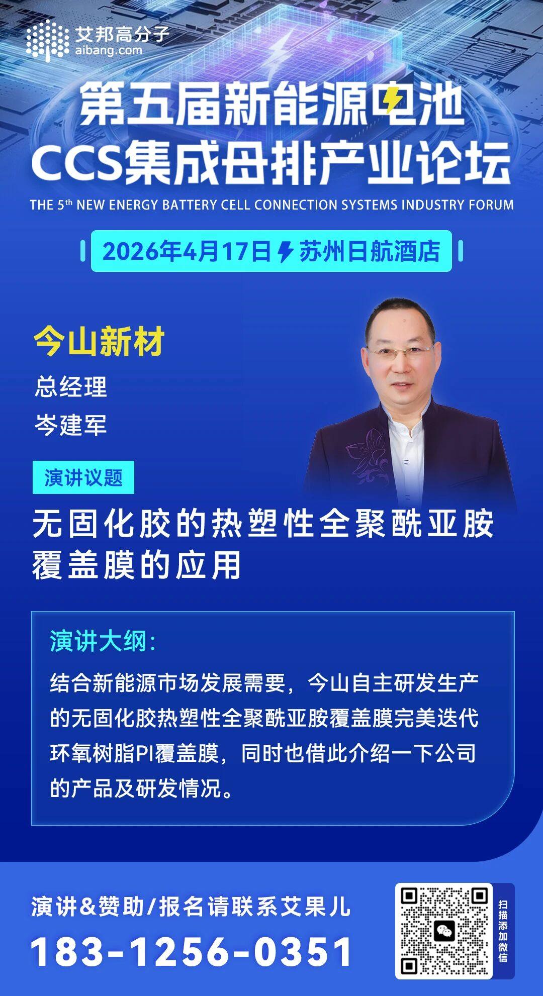 岑建军,男,1992 年毕业于清华大学,高级工程师,宁波大学材料与化工专业硕士研究生兼职导师。长期致力于聚酰亚胺的技术研究与市场应用开发,是宁波今山电子材料有限公司(2002成立)和宁波今山新材料有限公司的创始人(2011 年成立),开发出了多款进口替代的功能化聚酰亚胺薄膜。