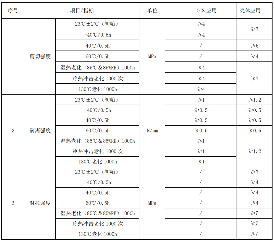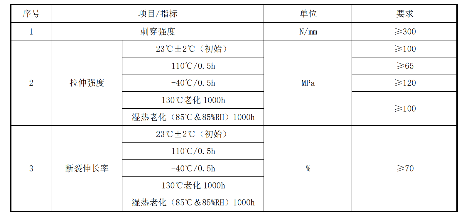 团体标准《动力电池信号采集板封装热压绝缘胶膜技术条件》中,对于热压绝缘胶膜的技术要求如下: