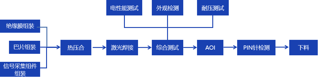 CCS集成母排热压工艺,是将信号采集组件(FPC/PCB/FFC/FDC等)、铝巴、绝缘封装膜等原材料组装好后通过热压机压合成型,再通过焊接方式实现镍片和铝巴的电连接,然后进行视觉检测、电性能检测等检测后包装入库。