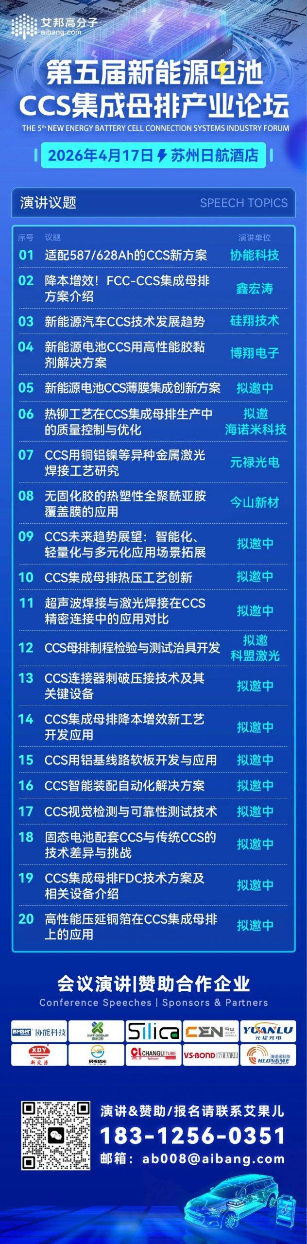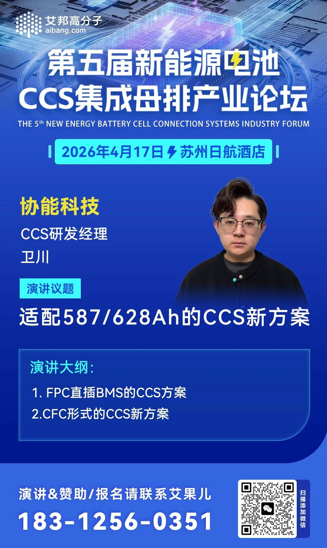 4月17日,协能科技 CCS研发经理 卫川 将作为演讲嘉宾出席第五届新能源电池CCS集成母排产业链论坛,发表主题演讲——《适配587/628Ah的CCS新方案》,期待大家与会交流。