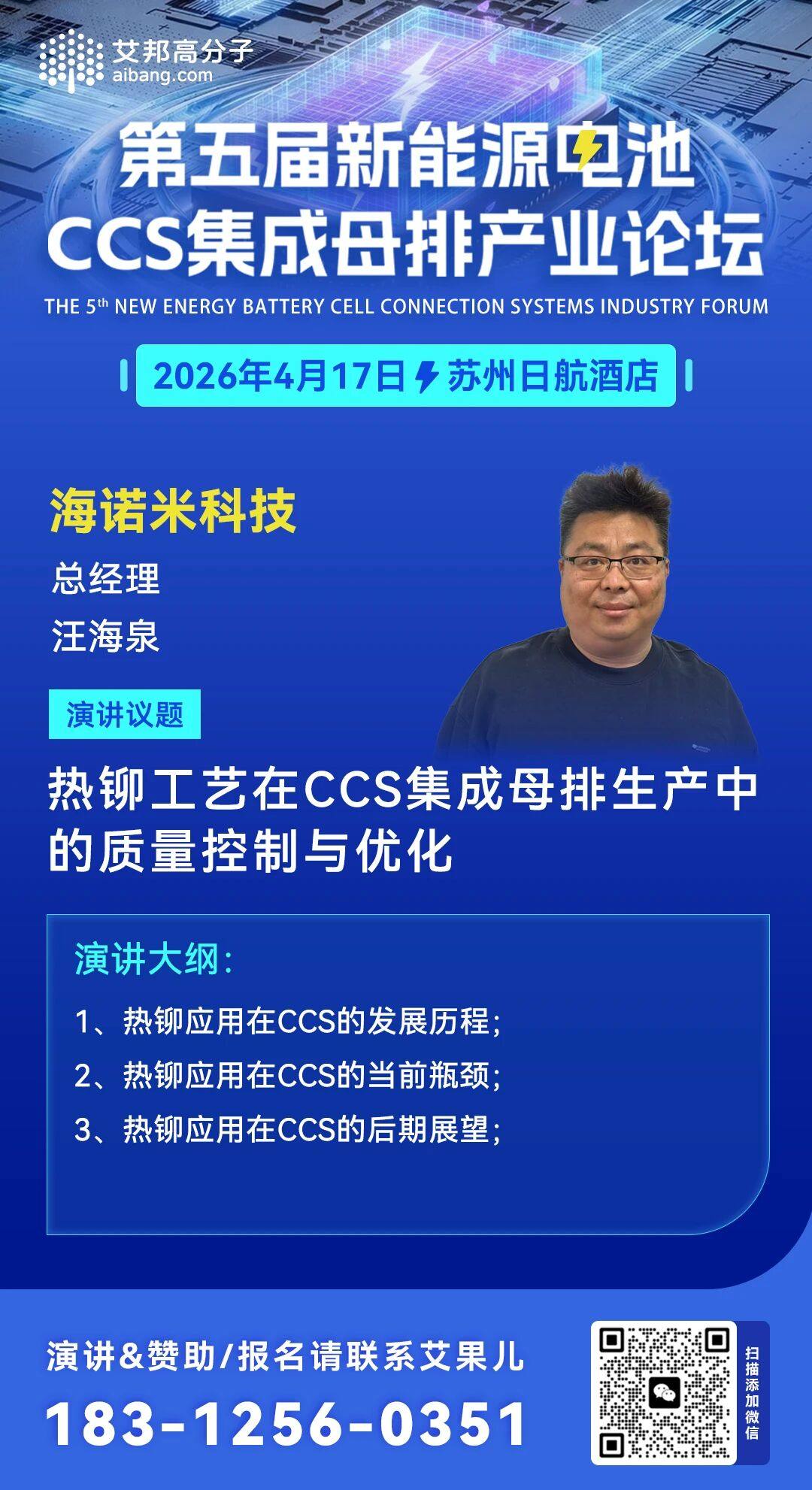 4月17日,常州海诺米超声设备科技有限公司 总经理 汪海泉 将作为演讲嘉宾出席第五届新能源电池CCS集成母排产业链论坛,发表主题演讲——《热铆工艺在CCS集成母排生产中的质量控制与优化,期待大家与会交流。