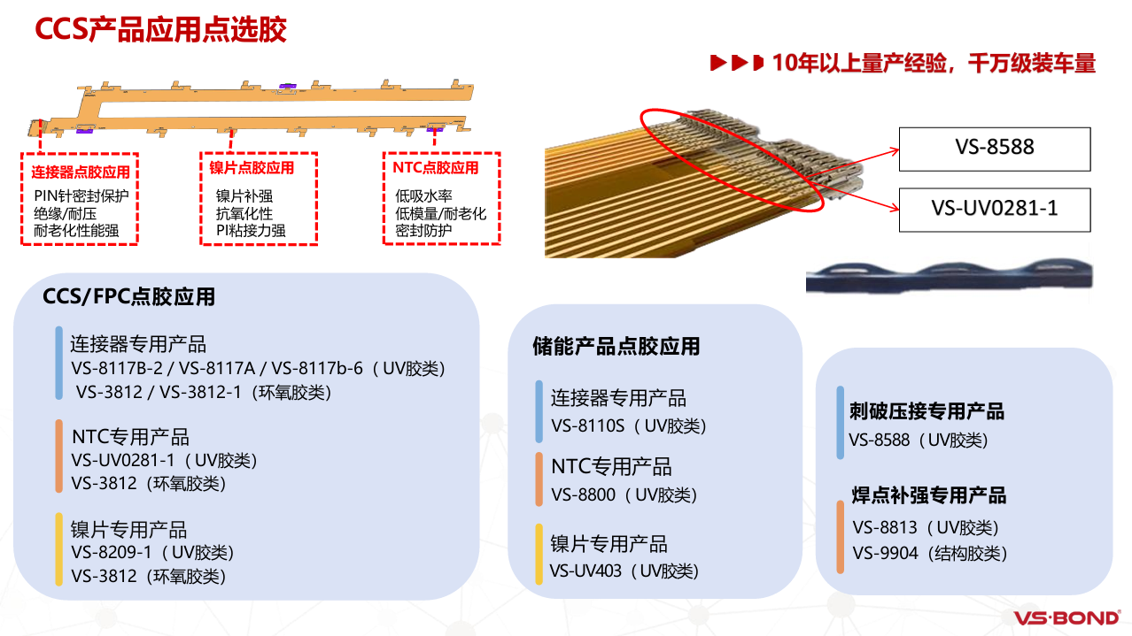 汽车动力电池和储能电池CCS的应用场景提出对胶水防护的要求和重要性,并针对应用要求分析目前汽车动力电池和储能电池CCS/FPC部件场景下胶水应用情况和未来技术走向,分析比较FPC用UV固化胶水与热固胶水的区别。